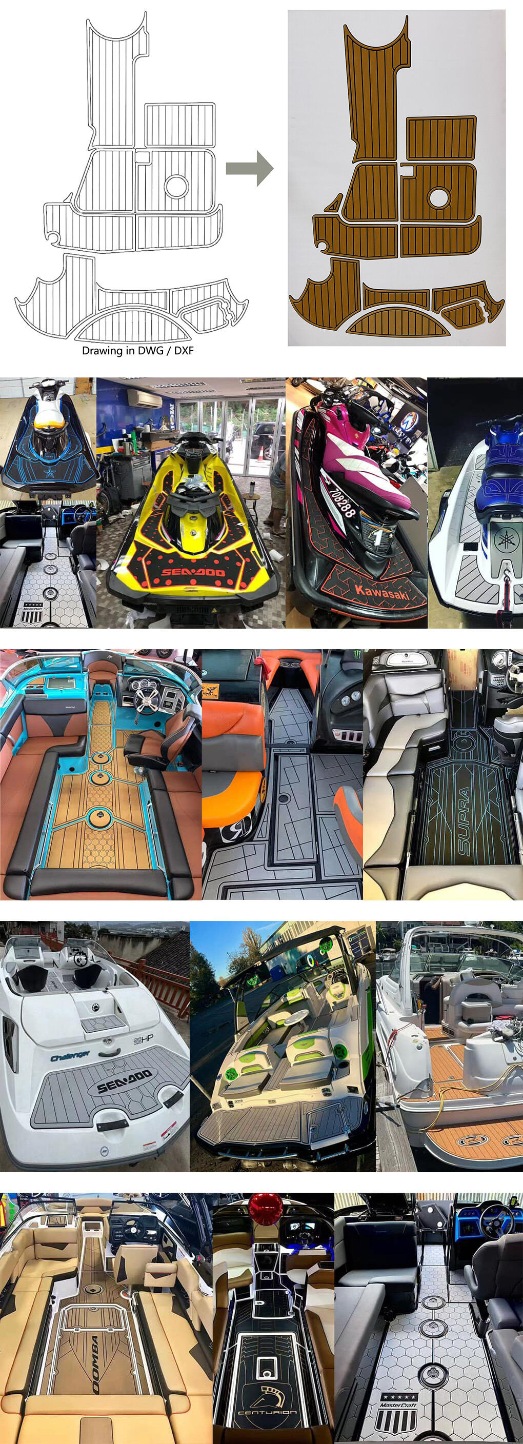 DWG/DXF形式でボートの図面を送っていただくか、プラスチックフィルムまたは段ボールを使用してボートの床を採寸し、それを送ってください。床のデザインは、任意のパターンと色で対応可能です!